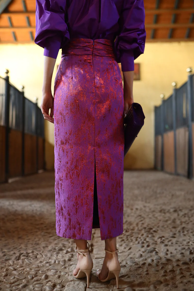 & Free ShippingFalda midi de lujo en morado fucsia con patrón texturizado metálico. ¡Estiliza tu figura y brilla con elegancia única!