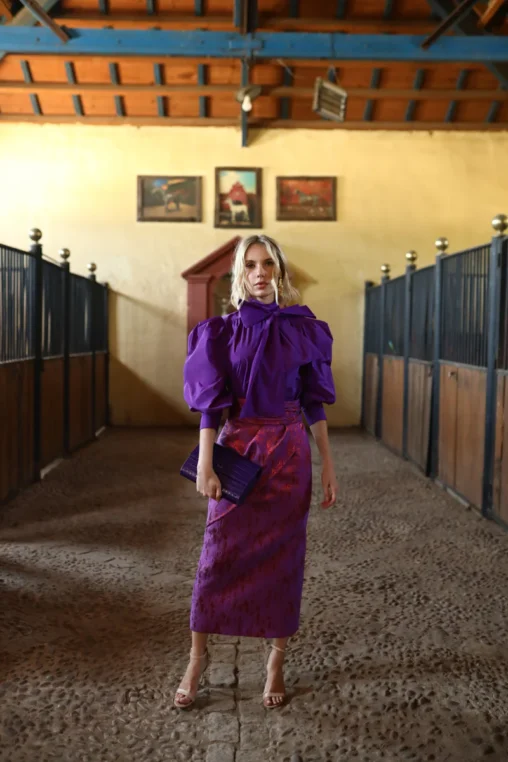 & Free ShippingElegante falda midi TerraWoman en jacquard metalizado púrpura. El toque de distinción y lujo perfecto para tus eventos más especiales.