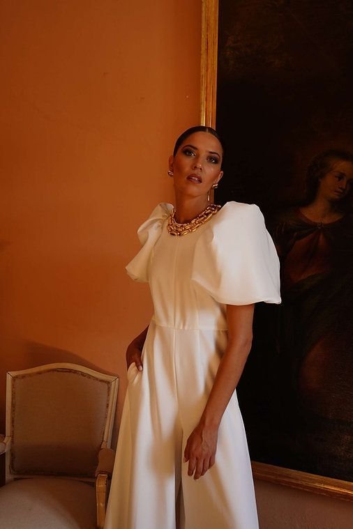 Descubre la definición de sofisticación moderna con nuestro AS_Vestido Blazer Elegante, una pieza que redefine la moda para ocasiones especiales. Este mono enterizo en un impecable tono blanco roto es la elección perfecta para quienes buscan destacar con un estilo único y refinado. Su diseño se distingue por un cuello redondo clásico que enmarca el escote con elegancia, y unas espectaculares mangas cortas abullonadas que aportan un volumen dramático y una estructura arquitectónica, reminiscentes de la alta costura y la formalidad de un blazer chic. La silueta se ciñe delicadamente en la cintura, creando una figura esbelta, para luego fluir en unos pantalones anchos de pierna recta o palazzo que ofrecen una comodidad inigualable y un movimiento grácil. Los discretos bolsillos laterales añaden una funcionalidad práctica sin comprometer la estética. Confeccionado en un tejido con cuerpo y una caída exquisita, posiblemente un crepé de alta calidad o una mezcla de poliéster premium, este atuendo promete un ajuste perfecto y una apariencia impecable. Ideal para bodas, cócteles, eventos de gala o cualquier celebración donde quieras proyectar confianza y glamour. Combínalo con accesorios dorados para un look impactante y eleva tu guardarropa con esta joya de diseño que te hará sentir espectacular y captar todas las miradas.
